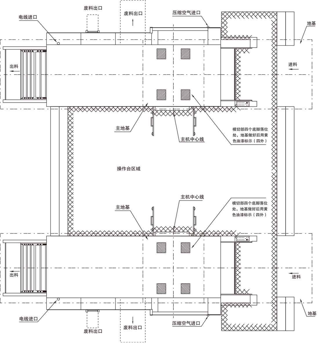 Because the same foot pedal is shared, the intermediate channel (at least 2×10 meters) when the two machines are placed separately, can save 2×10=20m2 of plant occupation area.